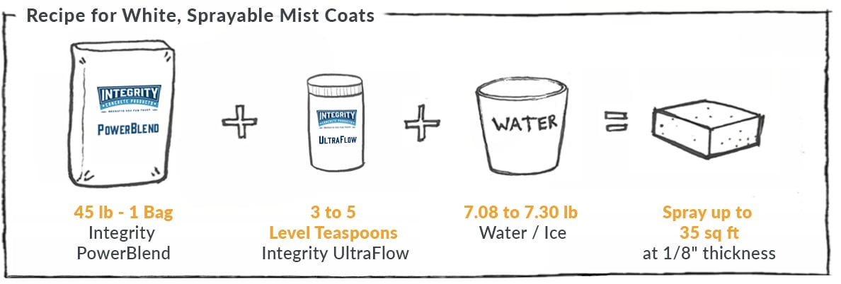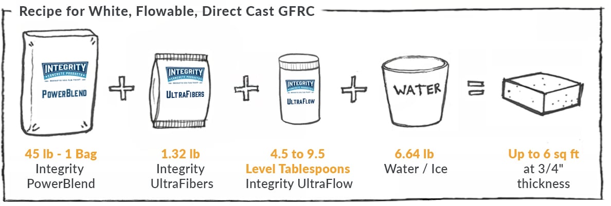 Below are mix design recipes for white GFRC concrete countertops using one bag of Integrity PowerBlend across several common casting methods.